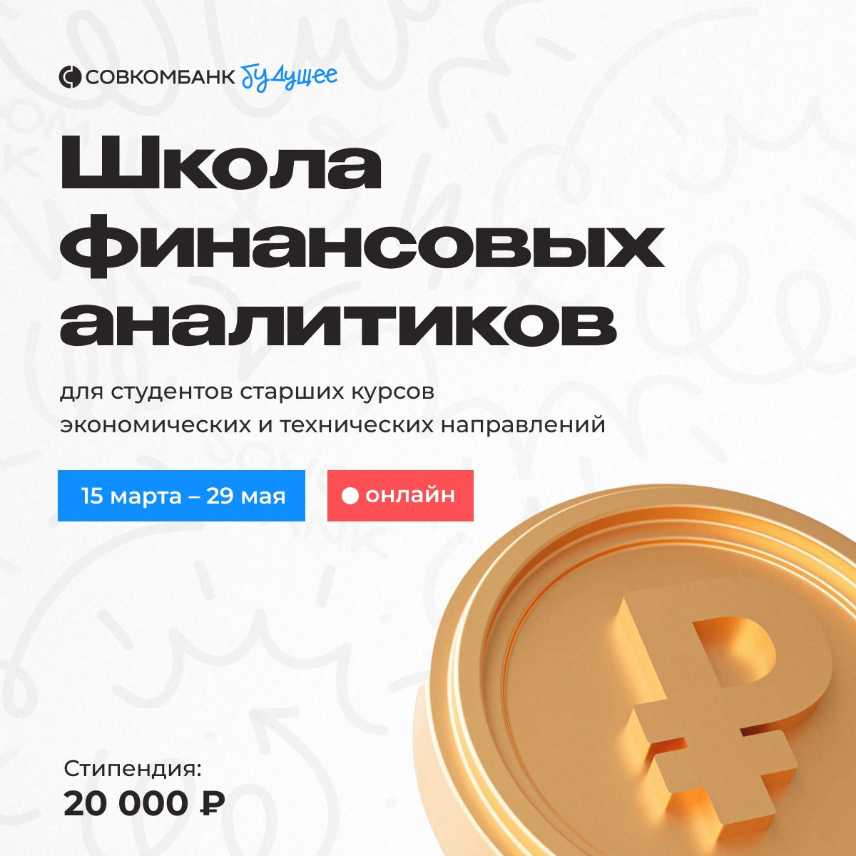 С 15 марта по 29 мая Совкомбанк проведёт образовательный интенсив для лучших студентов ведущих вузов страны.