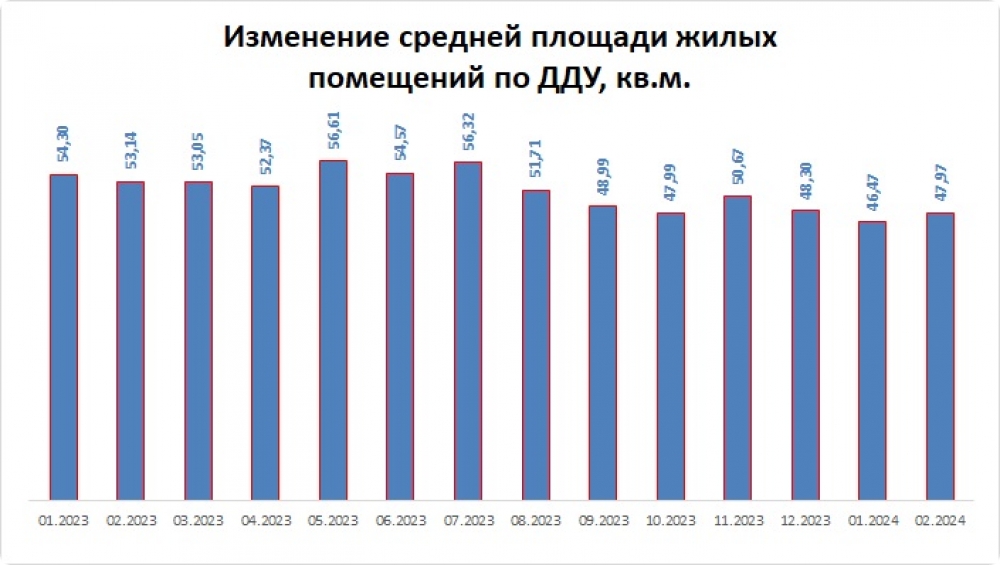 Среднее значение площади реализуемых квартир по ДДУ в феврале 2024г. немного подросло и составило 48 кв.м., в январе этот показатель составлял 46,5 кв.м. По информации ЕРЗ.РФ средняя площадь строящихся квартир в России по итогам 2023г. - 49 кв.м., в Москве – 54,4 кв.м. (по итогам февраля 2024г.)