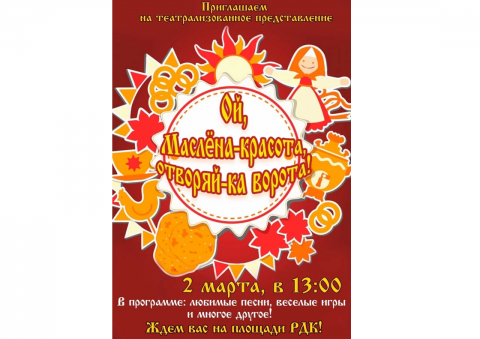 Театрализованное представление «Ой, Маслена - красота, отворяй - ка ворота!» состоится 2 марта в 13:00 на площади РДК.