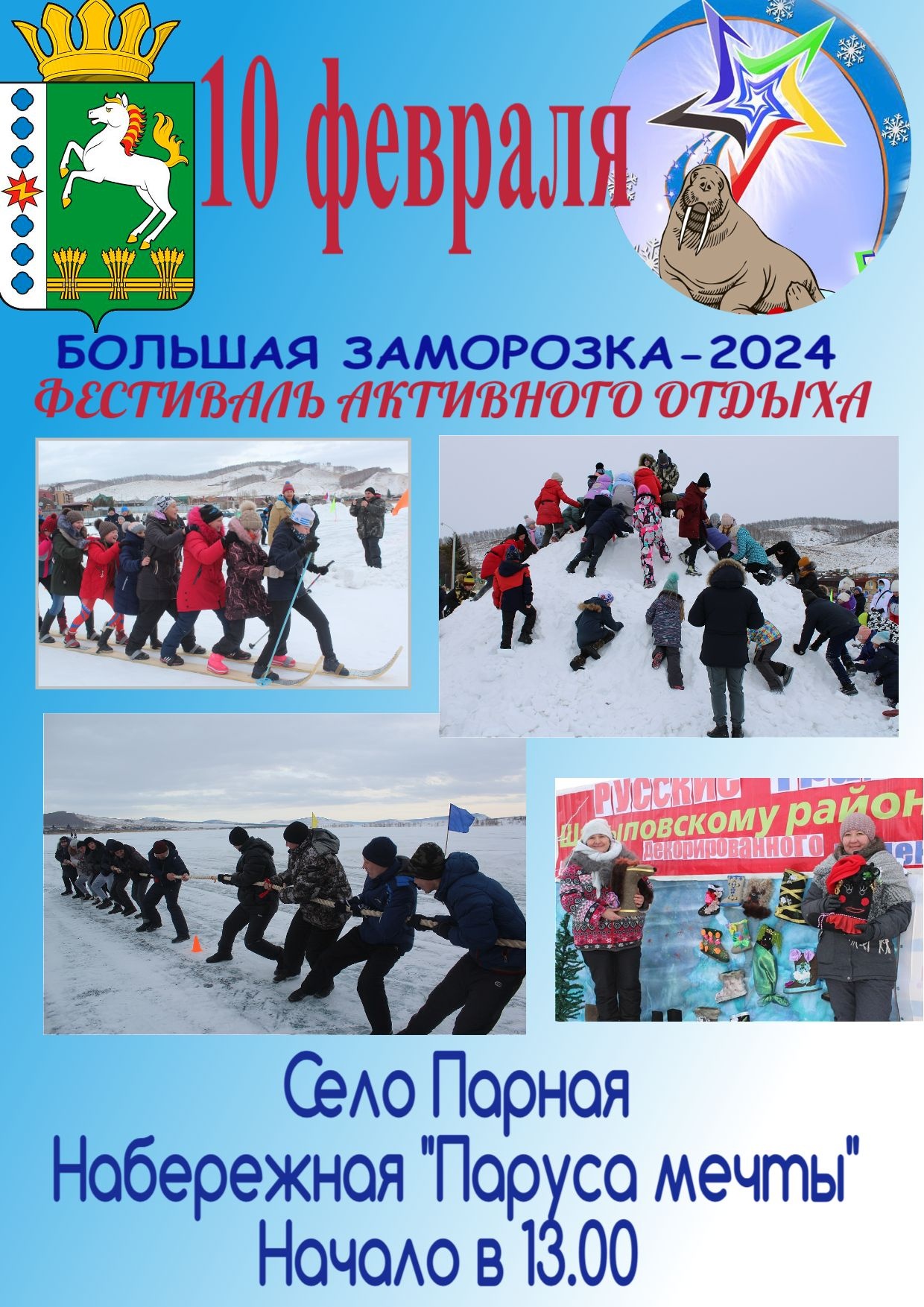 Старт фестиваля 10 февраля в 13-00 в центре села Парная, на открытой сцене набережной «Паруса мечты».