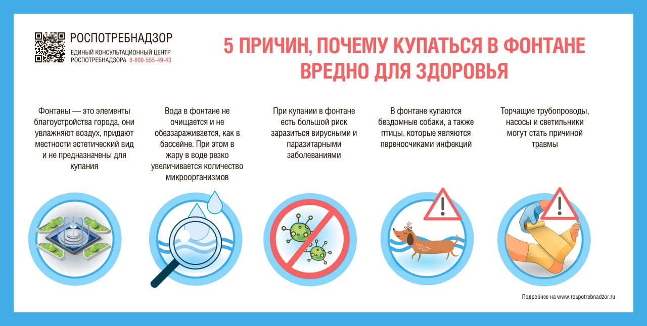 Вода в фонтане не очищается и не обеззараживается, как в бассейне. Эти городские оазисы притягивают не только людей, но и животных, в частности бездомных собак и птиц. Они переносят различные инфекции. А жара способствует активному размножению микроорганизмов.